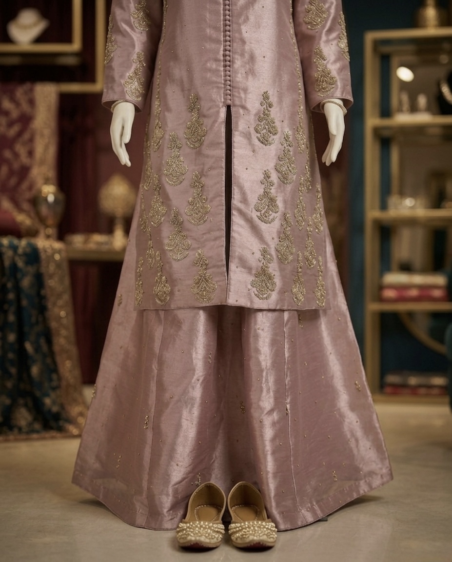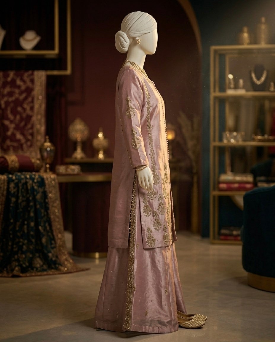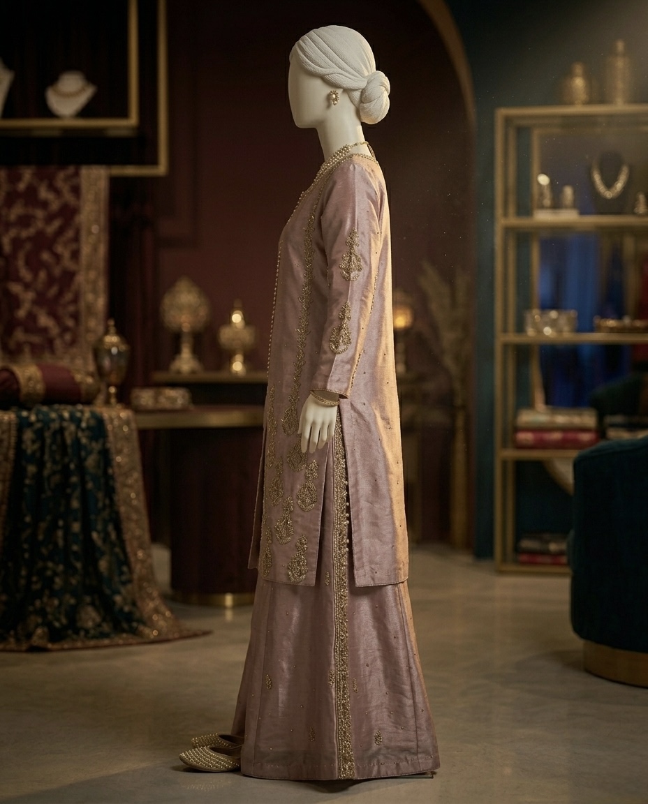 The sophisticated dusty rose hue and regal silhouette make it the ultimate luxury Nikah guest outfit or traditional zardosi tunic for festive celebrations. Whether you are searching for a muted pink heavy embroidered sharara or a high-end embroidered silk tunic, this ensemble offers the perfect blend of heritage craftsmanship and contemporary style.