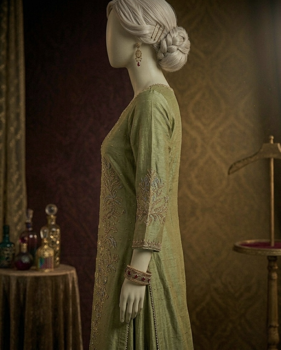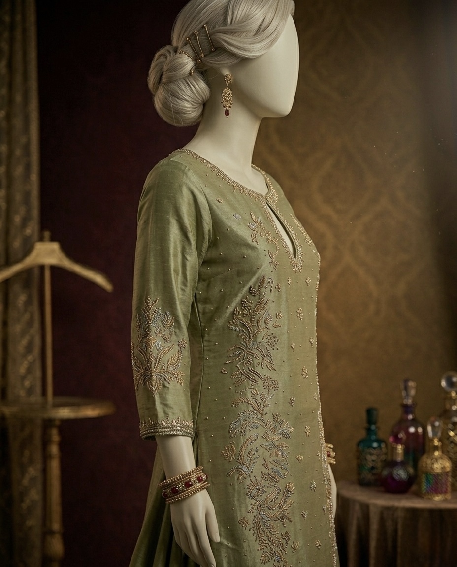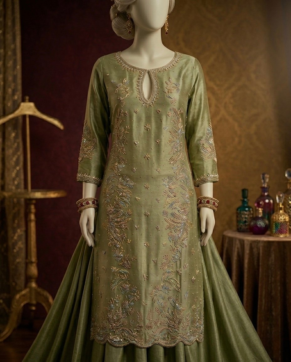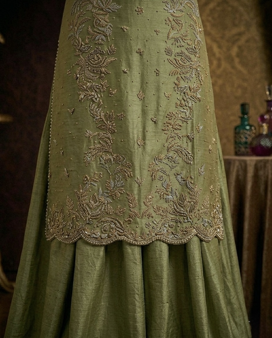 The centerpiece of this look is a long tunic (Kameez) rendered in a sophisticated Sage Green. The shirt features an intricate keyhole neckline and is meticulously adorned with hand-embellished Zardozi, delicate gold thread work, and shimmering sequin detailing. The hemline is finished with a refined scalloped edge, adding a touch of artisanal grace to the structured bodice. Comes with matching silk dupatta with sequence spray.
