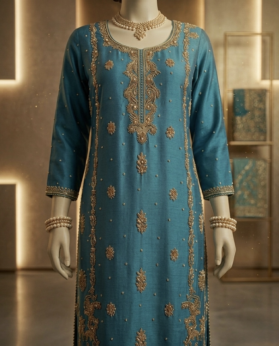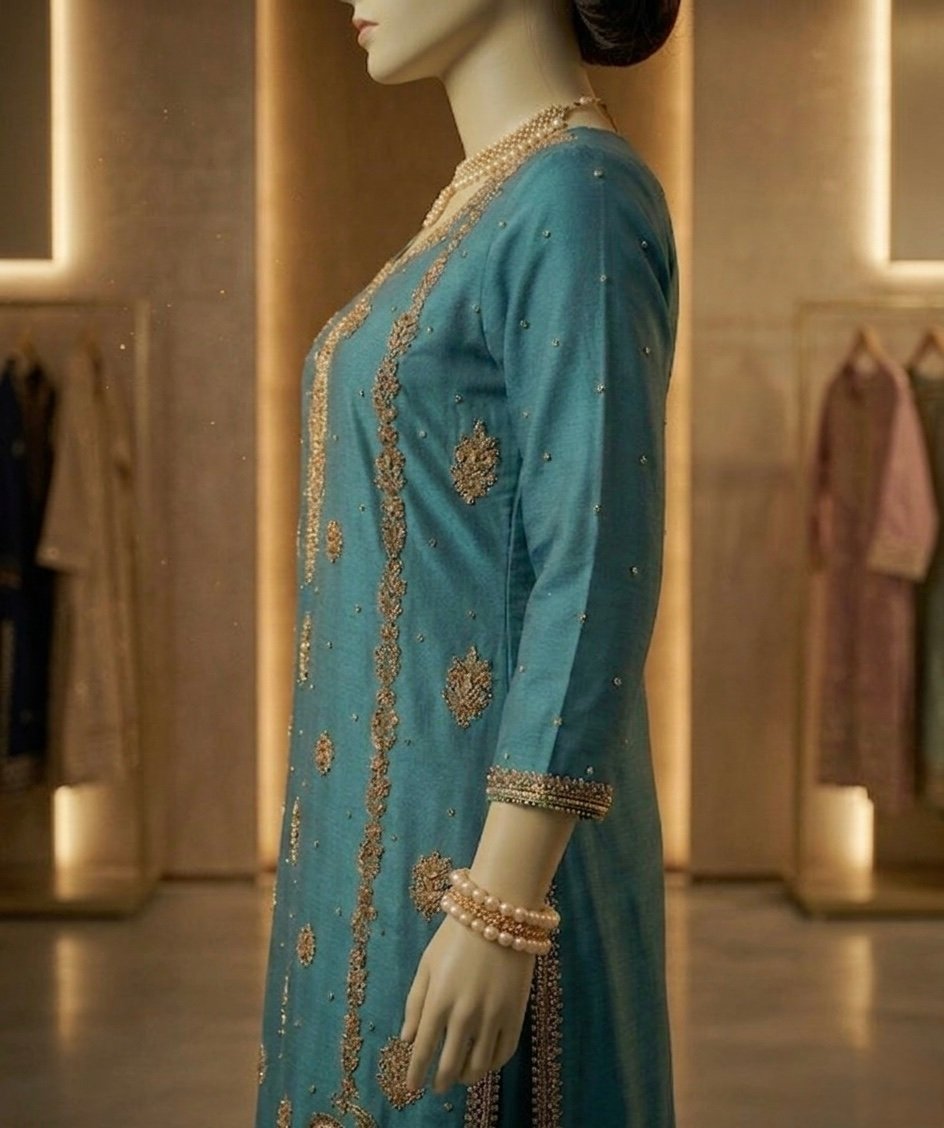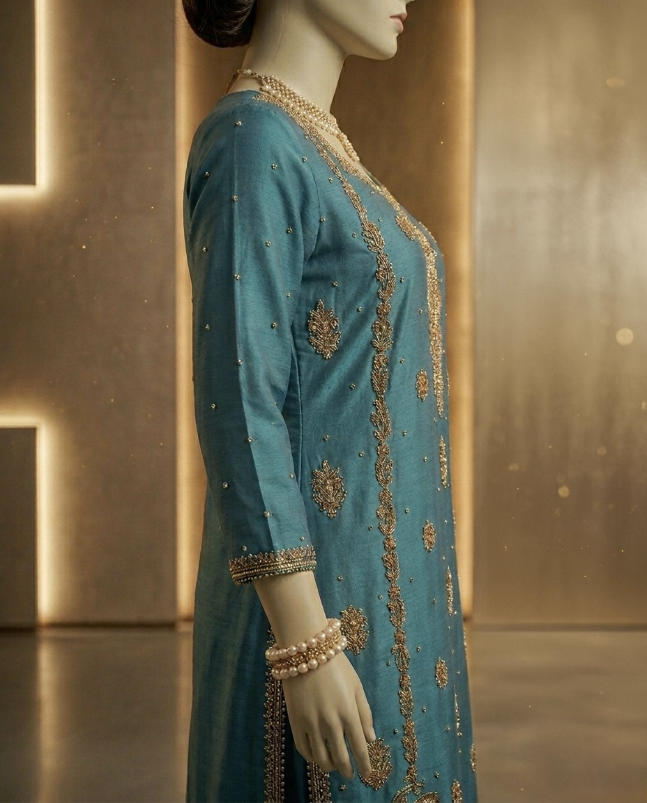 • Workmanship: Intricate Hand-Embellished Zardozi, metallic threads, and delicate beadwork.
