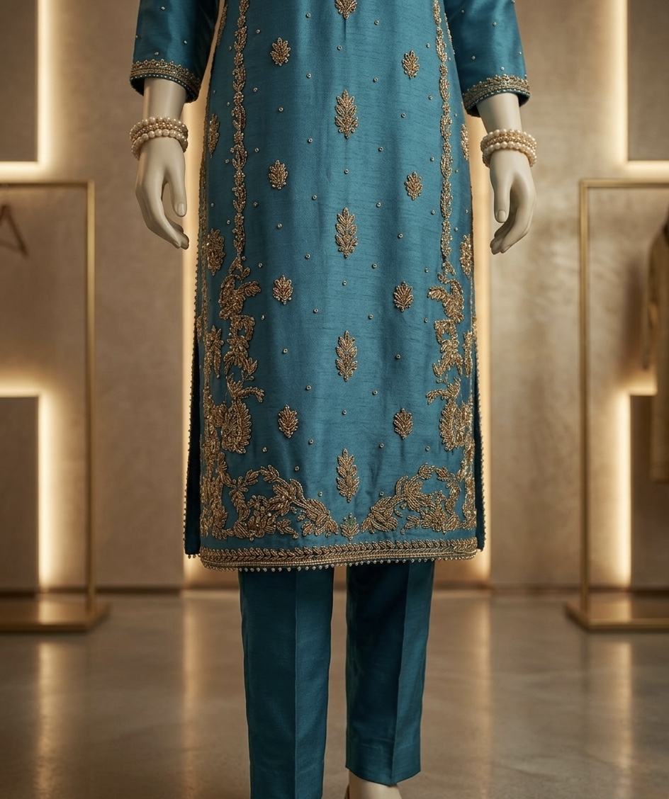 • Color: Rich Teal Green with radiant Gold Embroidery.